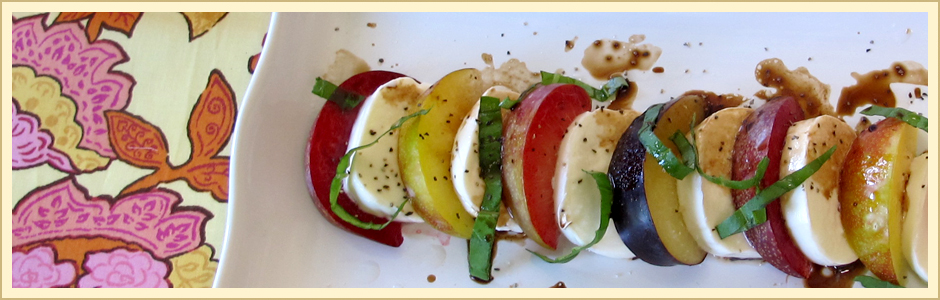 4 pluots, of various colors; pitted and sliced Alternate slices of pluot and mozzarella along each plate. Chiffonade the basil and place some on top of each salad. Sprinkle balsamic vinegar and olive oil generously over each salad. Add salt and pepper to taste.